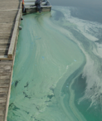 The rapid growth of these algae can result in the formation of large masses or scum called “blooms.” Some algal blooms are considered harmful as they may produce toxins that can be harmful to the health of people and pets. There’s no way to tell by looking at a bloom whether it contains toxins or not. As a precaution, regard any blue-green algal bloom as potentially toxic.