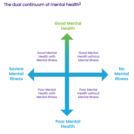 Mental health and mental illness intersect and exist on a dual continuum – people without a diagnosed mental illness can still have poor mental health and need help, and people with a mental illness can experience good mental health.
